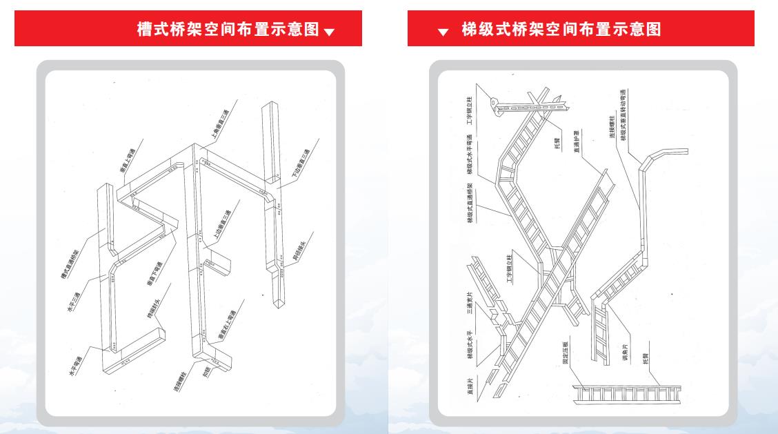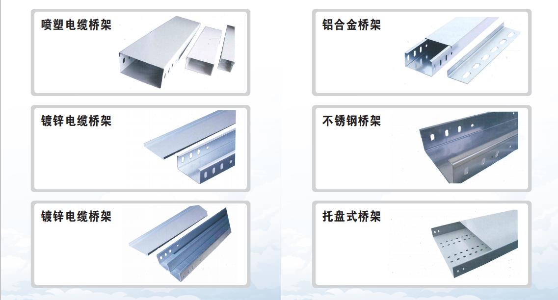 主要生产各式新型桥架:槽式、阶梯式、托盘式 组合电缆桥架系列、短节新式桥架。有静电喷塑、喷 漆、镀锌、热镀锌、镀锌镣等表面处理,结构轻、强
